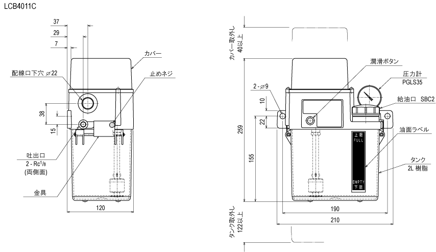 ルブリーユニットLCB4形は制御裝置なしのコンパクトな容積式自動(dòng)ポンプユニットです。ポンプMLB01W2はクマ取モーターを使用したポンプで、このポンプに2?タンクを組込んだ基本ユニットに圧力スイッチ、フロートスイッチ、圧力計(jì)を取付けた各種ユニットがあります。各ユニットとも制御裝置が付いていませんので、ポンプを間欠的に作動(dòng)させるため制御回路が必要となります。